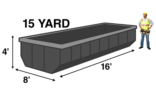 This dumpster is not designed for Concrete, Rocks or other heavy items. The 15 Yard Dumpster is best for general non-hazardous waste and it holds approximately 90 32-Gallon Trash Bags or 6 Standard pickup truck loads of waste. Use for yard care, home renovations, garage cleanouts, business cleanouts, ect…