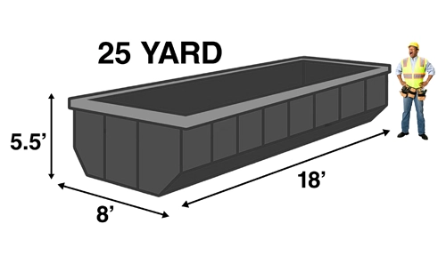 This dumpster is not designed for Concrete, Rocks or other heavy items. The 25 Yard Dumpster is best for general non-hazardous waste and it holds approximately 150 32-Gallon Trash Bags or 10 Standard pickup truck loads of waste. Use for yard care, home renovations, garage cleanouts, business cleanouts, ect…